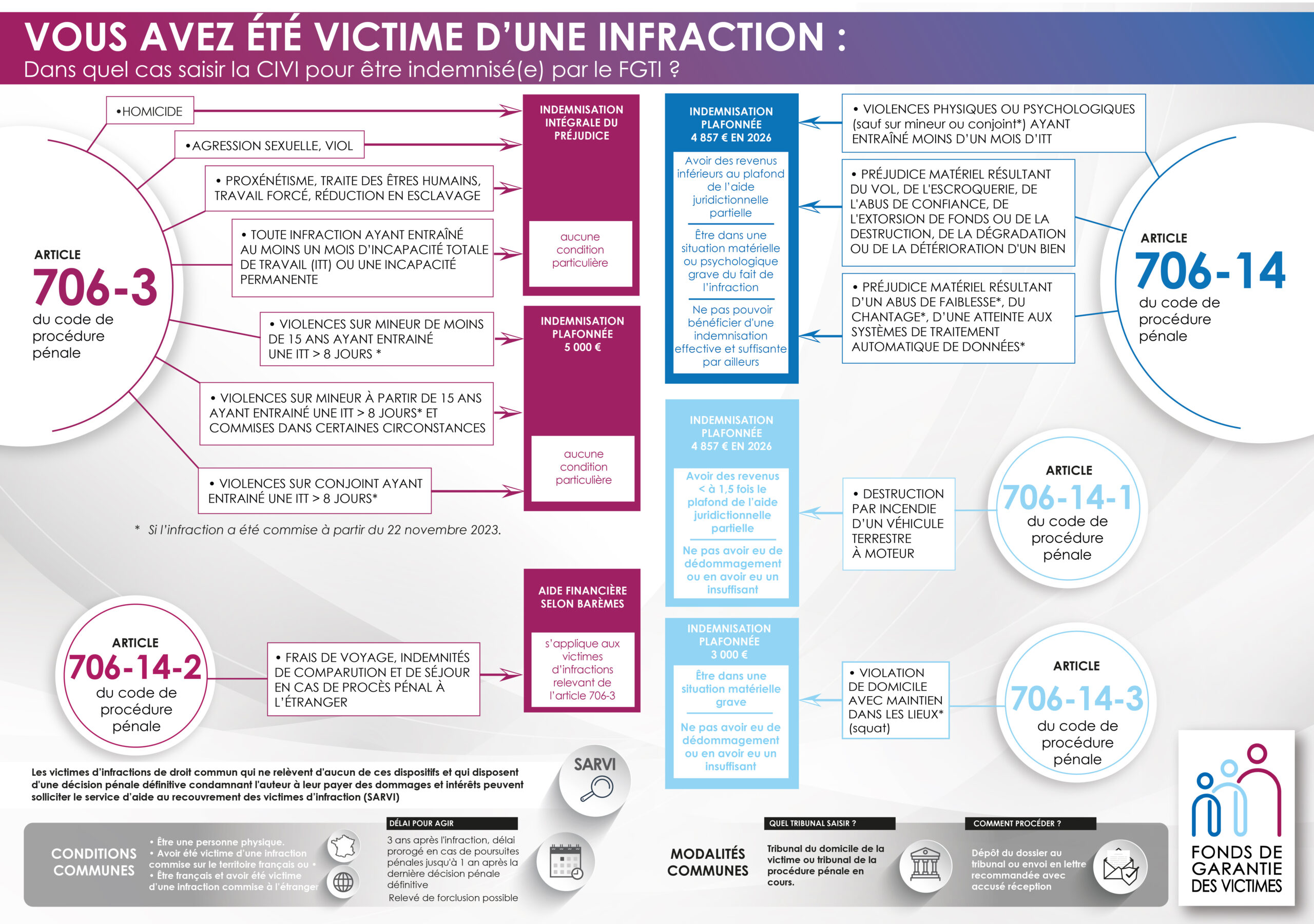 Le Fonds de Garantie des Victimes des actes de terrorisme et d’autres infractions (FGTI) est l’organisme chargé de vous indemniser en cas d’infraction. Il agit au titre de la solidarité nationale, à laquelle chaque assuré contribue. Après avoir indemnisé la victime, le Fonds se retourne contre les auteurs des dommages afin d’obtenir le remboursement des sommes versées.